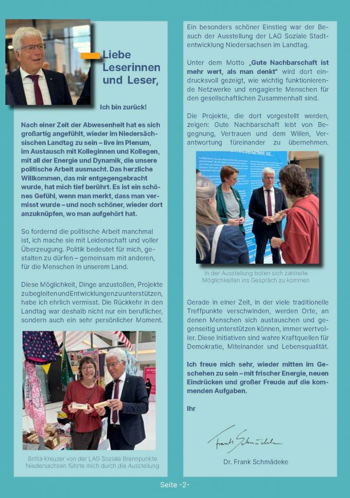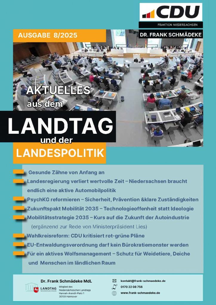 Dr. Frank Schmädeke ist zurück im Niedersächsischen Landtag – und meldet sich mit einer neuen Ausgabe seines Newsletters „Aktuelles aus dem Landtag“ (8/2025) zurück.